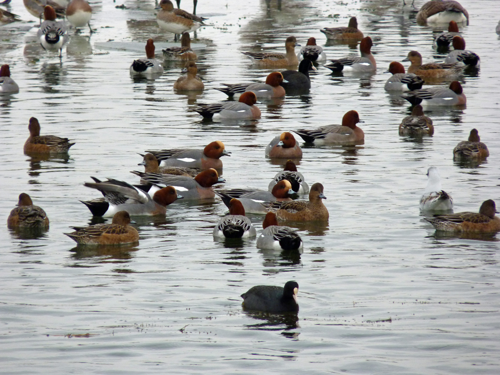 These little beauties had all crowed together into the only open area of water free from ice and were having a right song and dance calling and displaying along with Mute Swan and a few Coots not leaving much room for anything else. Stood around on the ice Black Headed and Common Gulls with a few Mallards and Canada Geese, with a couple of Redshank around the pool edges. It wasn’t long before the Wigeon headed off towards the river with me walking on behind, or should I say skating on behind.