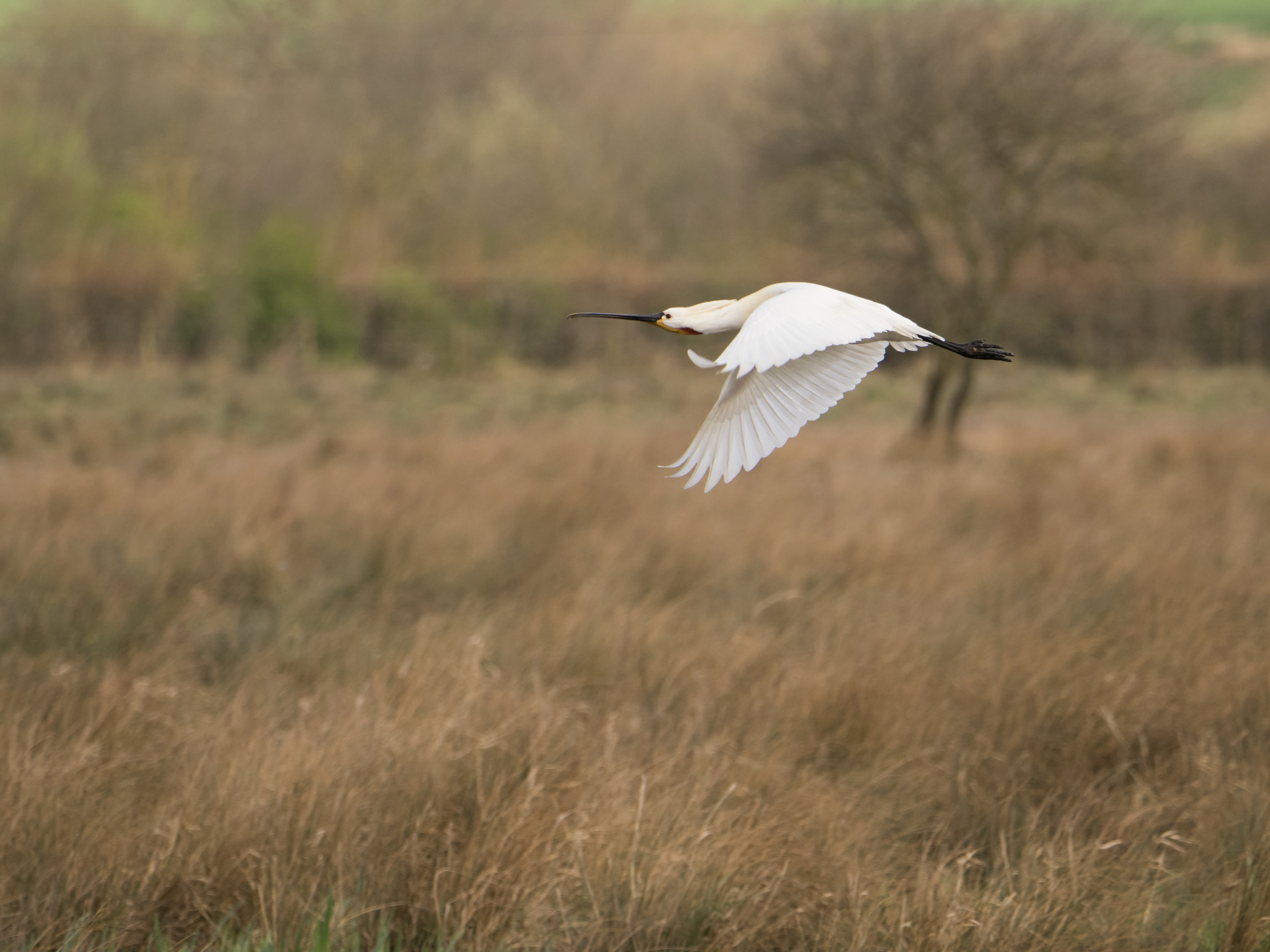 I moved on down towards Lin Dyke as the Spoonbills looked as if they had settled near to the Lin Dyke hide, it looked along way from where I was standing. Finally arriving seeing very little on my journey down here, around the hide were a few Chiffchaffs. It looked as if the Spoonbills had moved, but not far, I managed a couple of shots before they took flight again, back to where I had just come from, I managed a couple of flight shots before they got to far away, there was also two Cattle Egret present down here amongst the Highland Cattle.