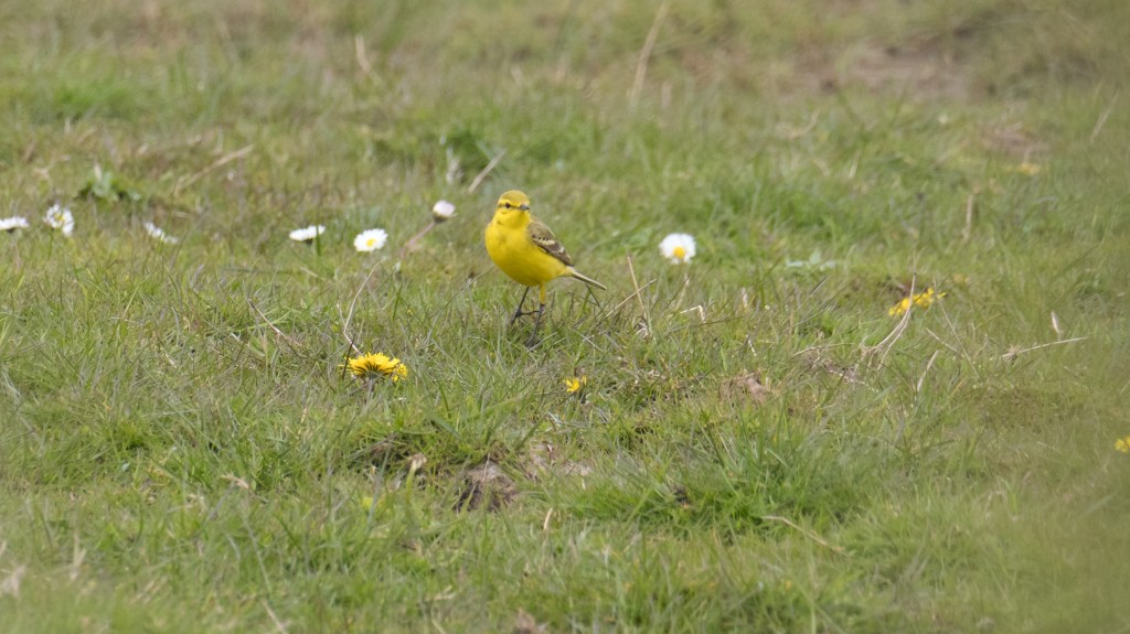 Hearing then that the Red Breasted Goose had moved on to the far field, I headed off that way, a bit of a walk but did see Skylarks, Meadow Pipits, Little Egret, Redshank and Dunlin on the way, but never did seethe Red Breasted Goose. Back up near visitor centre, looking out towards the farm building, someone had found some distant Yellow Wagtails, they easily stood out due to the colourful plumage..