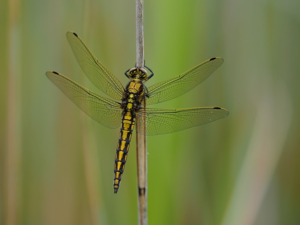 My next contact was at the Visitor Centre pond with lots of Azure Damselflies, resting up on the vegetation surrounding the pond, closer inspect of the pond reeds revealed a large Exuvia, this was probably Emperor Dragonfly. Moving on I saw a couple of guys taking photos near the reed bed, I had to be nosy, it paid off, they were looking at two Dragonflies that were rested up, one a Four spotted Chaser the other was an Immature Male Black tailed Skimmer. Looking around the other ponds I found little elde of note, no butterflies either, there were a few Swollen thighed Beetles about, especially on the Ox-eye daises.
